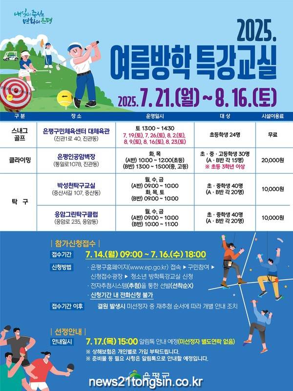 서울 은평구(구청장 김미경)는 관내 초·중·고등학생을 대상으로 ‘2025년 여름방학 생활체육 특강교실’을 운영한다고 밝혔다.