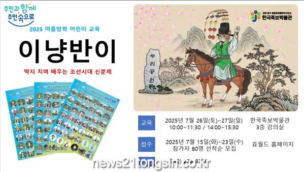 대전 중구(구청장 김제선)는 한국족보박물관에서 여름방학을 맞아 초등학생 자녀와 가족을 대상으로 특별 교육 프로그램 ‘이냥반이’를 이번 달 26일부터 27일까지 총 4회에 걸쳐 운영한다고 밝혔다.