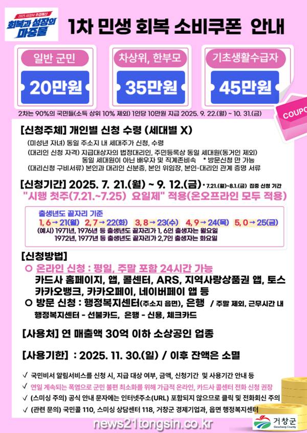 거창군은 새 정부 경제 활성화 정책에 맞춰 소상공인과 자영업자의 매출 증대 및 지역경제 회복을 이끄는 ‘민생회복 소비쿠폰’ 1차분을 7월 21일부터 지급한다고 14일 밝혔다.