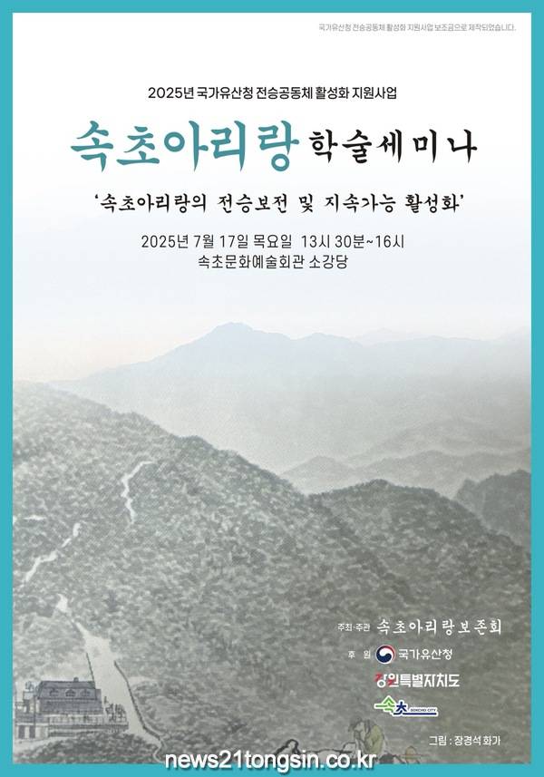 속초아리랑보존회는 7월 17일 오후 1시 30분부터 4시까지 속초문화예술회관 소강당에서 ‘속초아리랑의 전승보전 및 지속가능 활성화’를 주제로 학술 세미나를 개최한다.