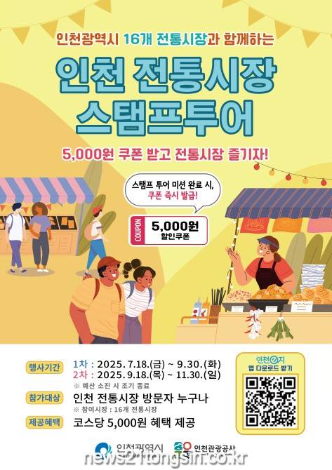 인천광역시(시장 유정복)와 인천관광공사(사장 백현)는 전통시장의 매력을 널리 알리고 지역 경제 활성화를 도모하기 위해 ‘매력으뜸 전통시장 육성사업’의 일환으로 오는 7월 18일부터 11월 30일까지 두 차례에 걸쳐 ‘전통시장 모바일 스탬프투어’를 개최한다고 밝혔다.