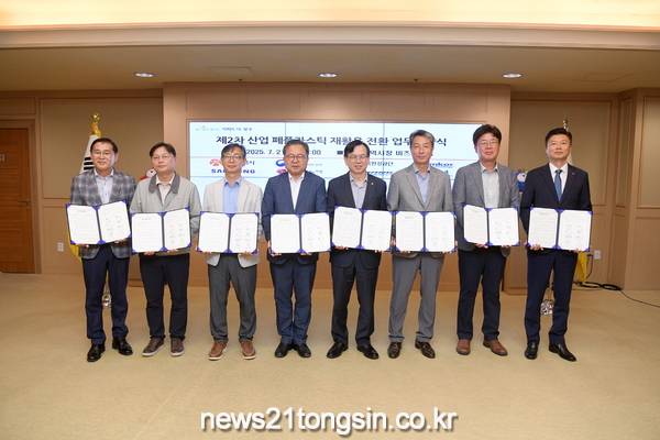 광주광역시(시장 강기정)는 21일 시청 비즈니스룸에서 영산강유역환경청, 한국환경공단 광주전남제주환경본부, 지역 대표기업들과 ‘제2차 산업 폐플라스틱 재활용 전환 민‧관 업무협약’을 체결했다.
