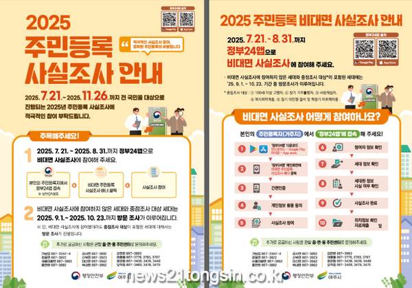 주민등록 사실조사는 정부24(모바일)을 통해 비대면-디지털 조사를 7월 21일부터 8월 31일까지 실시하고 이후 비대면 조사에 참여하지 않은 세대와 중점조사 대상 세대를 9월1일부터 10월23일까지 대면(방문) 조사를 실시한다.