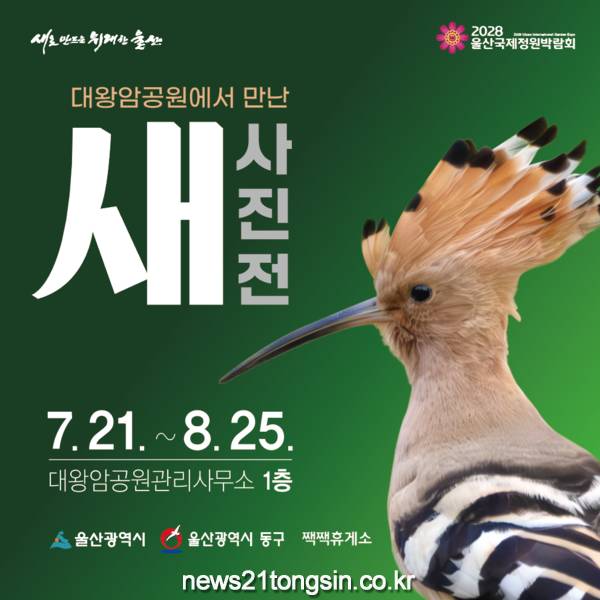 울산시와 동구청, 짹짹휴게소(조류 동호회)는 7월 21일부터 8월 25일까지 동구 대왕암공원관리사무소 1층 로비에서 조류 동호인들이 촬영한 새 사진전을 개최한다고 밝혔다.