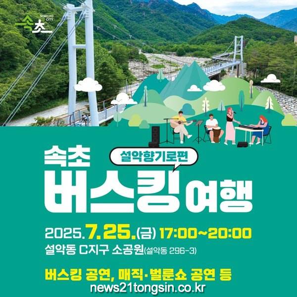 속초시는 시민과 관광객에게 문화예술 향유 기회를 제공하기 위해 ‘속초 버스킹 여행–설악향기로편’을 오는 7월 25일 오후 5시, 설악동 C지구 소공원에서 개최한다.