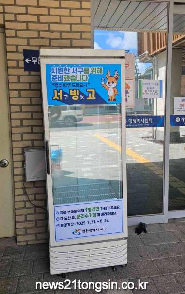 인천 서구(구청장 강범석)는 구민들이 일상생활 중 폭염에 따른 불편을 겪지 않도록 23개 동 행정복지센터에 생수 냉장고 ‘서빙고’와 ‘양심양산 대여’ 사업을 8월 말까지 운영한다고 22일 밝혔다.