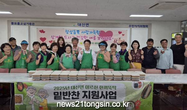 한편 대신면 지역사회보장협의체는 사회복지 공동모금회 지정기탁 배분사업비로 3월부터 대신면 새마을 부녀회와 적십자 봉사회와 함께 어르신 한끼뚝딱! 밑반찬 지원사업을 진행하고 있으며, 매주 50여명의 어려운 어르신에게 다양한 밑반찬을 만들어 전달하며 지역사회의 귀감이 되고 있다.