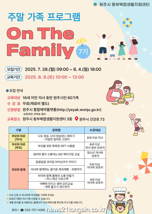 원주시 동부복합생활지원센터는 오는 8월 9일(토) 주말 가족 프로그램 ‘온 더 패밀리(On The Family)’ 7기 강좌를 운영한다.