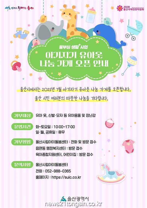 울산시는 7월 25일 오후 3시 울산시립아이돌봄센터에서 유아옷·수리수리 장난감 나눔가게와 유(U)-맘스 수면 휴게쉼터의 개소식을 열고 운영에 들어간다고 밝혔다.