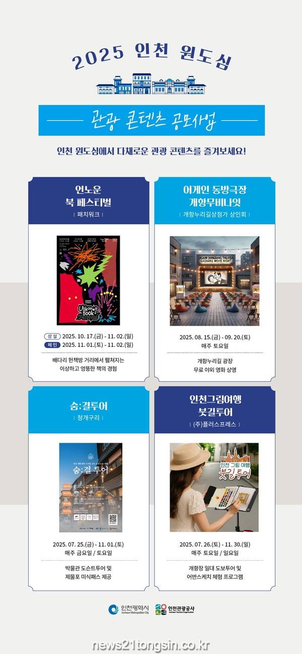 이번 공모전은 단순한 볼거리 중심이 아닌, 인천 원도심만의 고유한 정체성과 매력을 직접 체험할 수 있는 참여형 프로그램을 찾기 위해 기획됐다. 선정된 콘텐츠들은 7월부터 11월까지 원도심 일대에서 운영되며, 인천 개항장, 배다리 등 역사문화가 풍부한 지역에서 시민과 관광객에게 다양한 체험 기회를 제공할 예정이다.선정된 관광 콘텐츠 소개# 언노운 북 페스티벌동인천 배다리 헌책방 골목을 무대로 열리는 ‘언노운 북 페스티벌’은 인천의 유일한 헌책방 거리를 문화공간으로 재조명하고자 기획된 축제다. 이번 행사는 10월 17일부터 11월 2일까지 진행되며, 인근 서점 주인과 마을 상인, 지역 주민이 함께 참여하여 책을 매개로 한 공동체 문화를 만들어간다. 행사 기간에는 ▲헌책방 탐방 투어 ▲북마켓 ▲상설 전시 ▲책방 공연 등 독서와 예술을 아우르는 다양한 체험 펼쳐져, 책을 사랑하는 모두가 즐길 수 있는 열린 축제다.# 어게인 동방극장, 개항무비나잇과거 인천 대표 영화관 ‘동방극장’의 추억을 되살리고 지역 상권에 활기를 불어넣기 위해, 8월 15일부터 9월 20일까지 매주 토요일 개항누리길 광장에서 무료로 야외 영화를 상영한다. 가족 단위 관광객은 물론 지역 주민 누구나 함께 즐길 수 있는 열린 문화 행사로, 추억의 고전 영화부터 최신 상영작, 애니메이션 등 다양한 장르의 영화가 상영될 예정이다. 또한 포토부스 운영, 현장 참여 이벤트 등 다채로운 즐길 거리가 함께 마련돼, 관람객들에게 특별한 시간을 선사할 것으로 기대된다.# 숨;결투어 - 도보형 예술 및 미식투어‘숨;결 투어’는 개항장의 역사 문화 공간을 예술과 미식으로 체험하는 도보형 관광 프로그램으로, 7월 25일부터 11월 1일까지 매주 금·토요일에 진행된다. 투어는 한국 최초의 서양식 호텔이자 인천의 대표 문화자산인 ‘대불호텔 전시관’, 인천아트플랫폼의 도슨트 해설 투어, 그리고 지역 특색이 담긴 카페·음식점 탐방으로 구성된다. 참가자 전원에게는 2만원 상당의 ‘제물포 미식패스’가 제공되어, 제휴된 음식점에서 지역의 맛을 직접 경험할 수 있다.# 인천그림여행 붓길투어‘붓길 투어’는 전문 해설사와 함께 개항장 일대를 탐방하며, 현장에서 직접 그림을 그리는 참여형 체험 프로그램이다. 7월 26일부터 11월 30일까지 매주 토·일요일 운영된다. 참가자들은 개항장 일대의 문화유산과 주요 시설을 둘러보고 전문 작가의 지도 아래 자신만의 작품을 완성해 기념품으로 받을 수 있다. 역사와 예술, 참여를 결합한 특별한 투어는 가족, 연인 등 다양한 계층에게 특별한 경험을 선사할 것으로 기대된다.윤희청 시 관광마이스과장은 “이번 공모전은 인천 원도심만의 독특한 스토리와 정체성을 시민과 관광객 모두가 체험할 수 있도록 기획됐다”며, “앞으로도 원도심의 가치를 살리고 지속 가능한 관광 생태계를 만들기 위해 다양한 문화·관광 콘텐츠를 지속적으로 선보이겠다”고 말했다.
