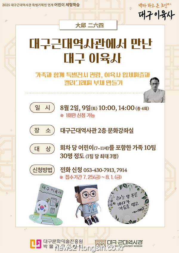(재)대구문화예술진흥원(원장 박순태) 박물관운영본부 소속 대구근대역사관은 현재 성황리에 개최 중인 광복 80주년 기념 특별기획전 ‘백마 타고 온 초인(超人), 대구 이육사’ 연계 행사로 어린이를 위한 ‘대구근대역사관에서 만난 대구 이육사’ 체험학습을 8월 2일(토)과 9일(토) 양일에 거쳐 총 4회 운영한다.