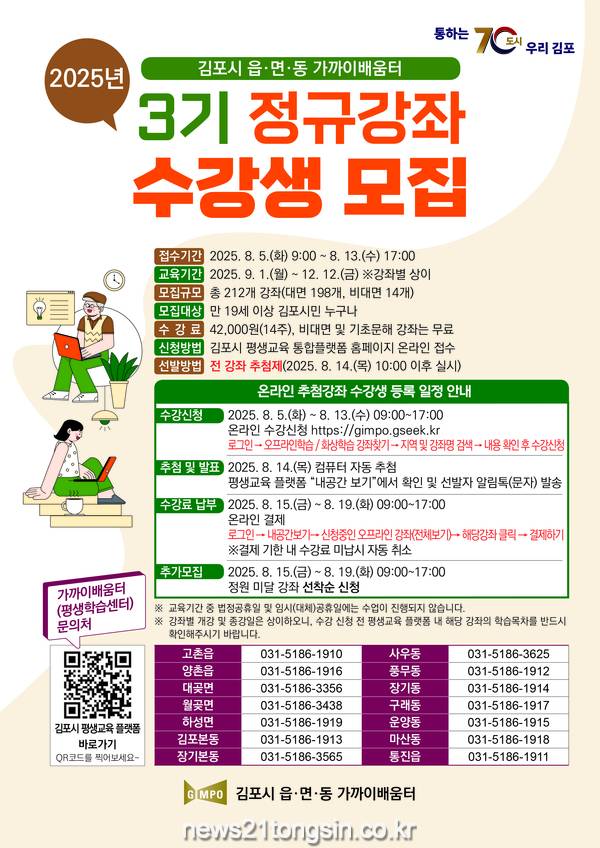 김포시(시장 김병수)는 시민들의 평생학습 참여 기회를 확대하고 학습 역량 향상과 삶의 질 증진을 위해 ‘2025년 제3기 읍면동 가까이배움터 정규강좌’ 수강생을 모집한다.