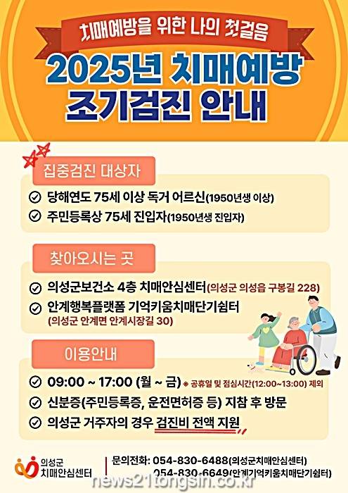 의성군(군수 김주수)은 치매 조기 발견과 중증화 예방을 위해 2025년 하반기부터 75세 진입자 및 치매고위험군을 대상으로 집중적인 조기검진을 지원한다고 밝혔다.