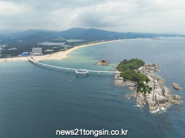 이번 사업은 죽왕면 오호리 연안 일원에 동해안 사계절 해양 관광 거점 시설을 조성하기 위한 것으로, 총사업비 484억 원(국비 205억 원, 도비 73억 원, 군비 206억 원)이 투입돼 육상·해상·해중 특화 시설 설치 공사가 진행 중이다.