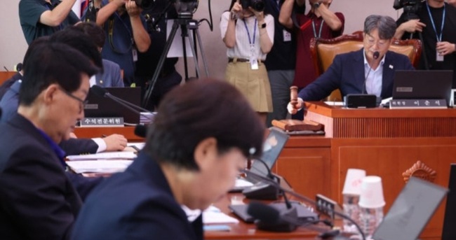 이 위원장은 박균택 민주당 의원의 토론 종결 제안이 있었다며 “우리 국회법을 보면 각 교섭단체에서 한 명 이상의 발언이 있고 토론 종결 제의가 들어오면 종결할 수 있게 돼 있다”고 반박했다.