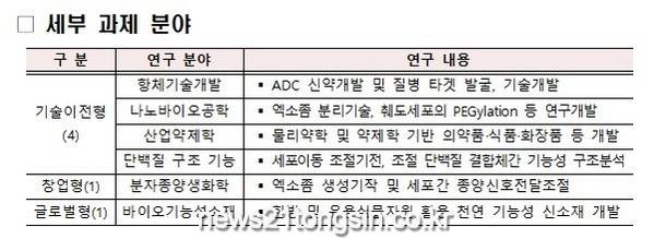 ❍ 맞춤형 지원 분야는 도(道) 특화산업인 바이오헬스를 중심으로, ▲기술이전형 4건(항체기술개발·나노바이오공학 등), ▲창업형 1건(세포 간 종양 신호전달 기전 연구), ▲글로벌형 1건(한방 및 식물자원 기반 천연 기능성소재 개발) 등 총 6개이다.