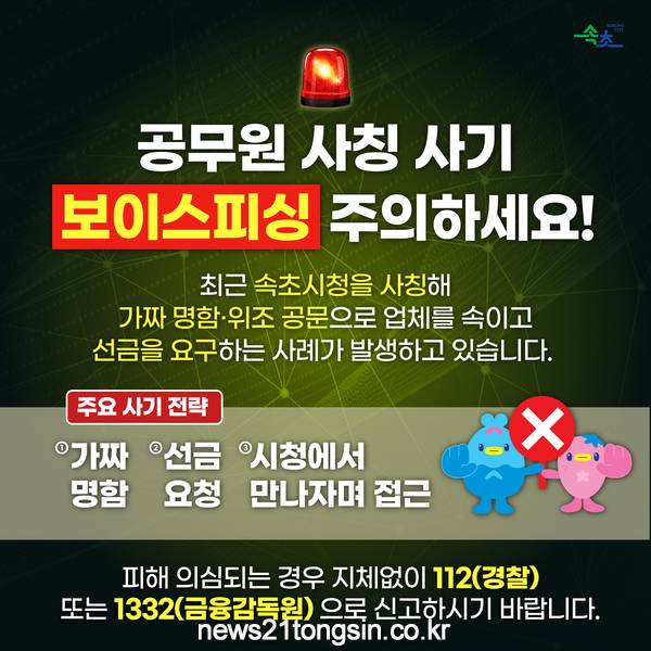 속초시가 최근 허위 공문서·공무원증·명함 이용 공무원 사칭 사기 사건이 빈번하게 발생함에 따라 각별한 주의를 당부하고 나섰다.