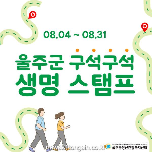 (뉴스21통신/우정석기자) = 울주군정신건강복지센터가 오는 31일까지 모바일 걷기 앱 ‘워크온(WalkOn)’을 활용한 ‘자살예방 구조물 스탬프 챌린지’를 운영한다고 7일 밝혔다.
