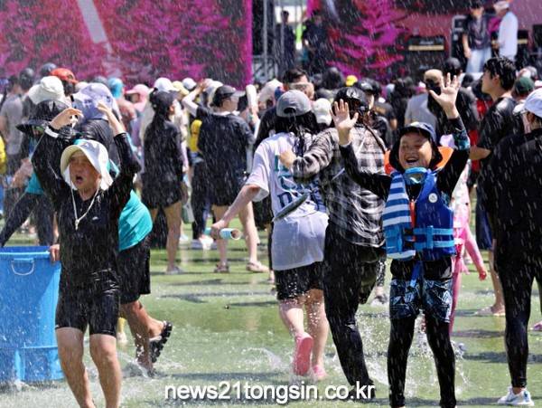 1일 장흥 물축제를 찾은 관광객들이 시원한 물줄기를 맞으며 무더위를 식히고 있다. ‘장흥은 지금 즐거움이 콸콸콸!’이란 슬로건으로 열린 올해 물축제는 8월 3일까지 탐진강과 편백숲 우드랜드 일원에서 펼쳐진다.