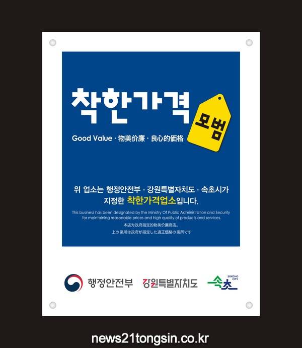 속초시 관계자는 “합리적인 가격과 양질의 서비스를 제공하는 착한가격업소를 확대하고 이에 대한 지원 역시 강화하여 지역 물가안정과 소상공인 경영 부담 완화라는 두 가지 효과를 동시에 달성할 수 있도록 최선을 다하겠다”라고 전했다.