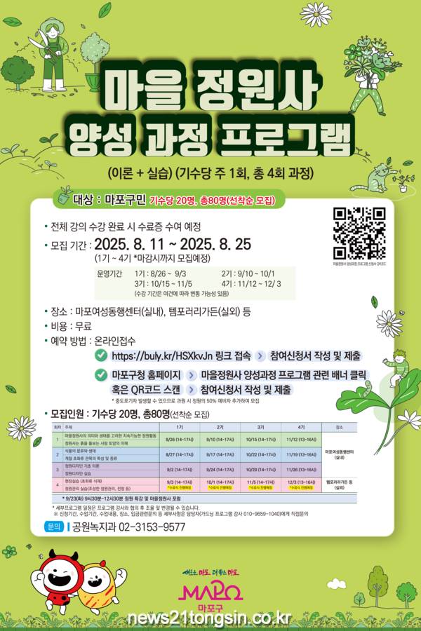 신청은 마포구청 누리집 배너와 신청 링크(https://buly.kr/HSXkvJn), 홍보물에 표기된 QR코드를 통해 가능하며, 선착순으로 마감된다. 수강료는 무료다.