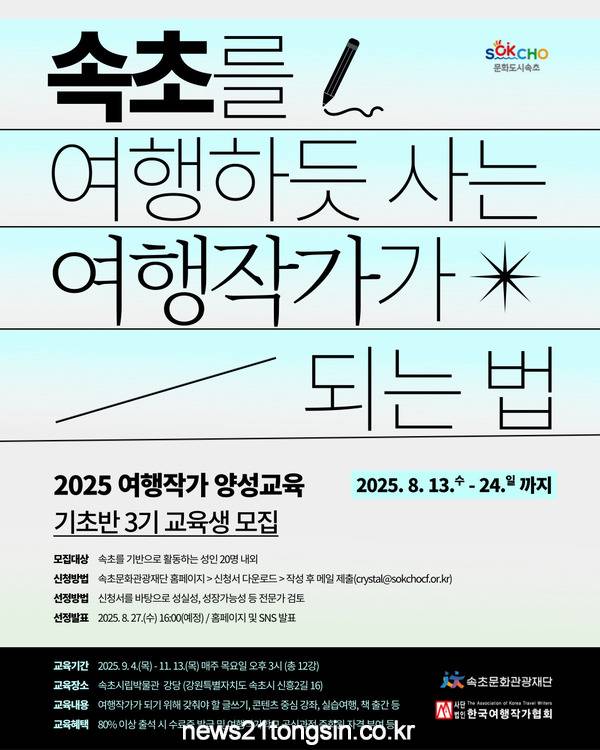 재단법인 속초문화관광재단(이사장 이병선, 속초시장)은 속초의 일상을 여행하듯 살아가는 ‘속초 여행작가 양성교육’ 기초반 3기 교육생을 모집한다.