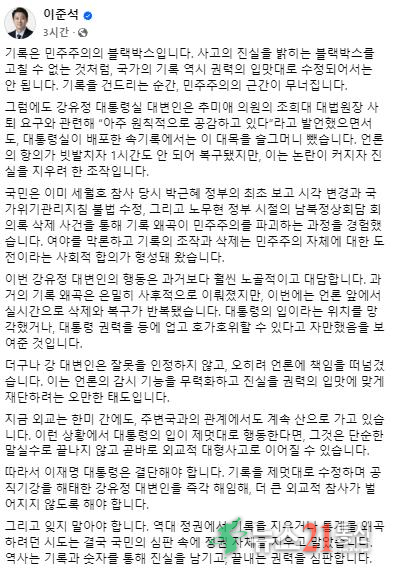 이 대표는 “과거 세월호 참사 보고 시각 변경, 남북정상회담 회의록 삭제 등 여야를 막론하고 기록 왜곡은 민주주의를 파괴했다는 사회적 합의가 있다”며 “이번 사안은 단순한 말실수가 아니라 외교적 대형 사고로 이어질 수 있다”고 경고했다. 그는 “대통령은 강유정 대변인을 즉각 해임해 더 큰 혼란을 막아야 한다”고 촉구했다.
