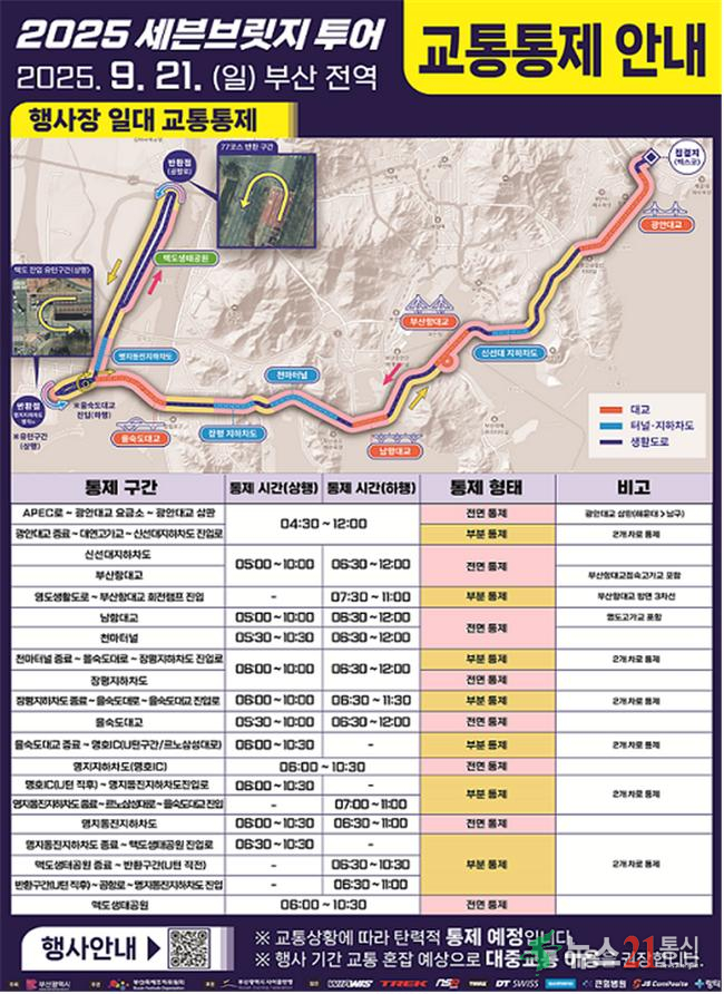 아울러 전 구간 교통 통제로 인한 시민 불편을 최소화하기 위해 통과 후 단계적 해제를 실시하고, 화물·영업용 차량과 대중교통 이용객을 위한 안내를 강화한다. 교통 통제 구간과 시간은 시 누리집과 행사 공식 홈페이지(busan7bridges.com), 인스타그램(@busan7bridges)에서 확인 가능하다.