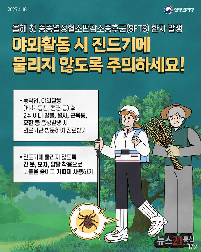 세부 예방수칙은 △야외활동 시 긴 옷, 긴 바지, 모자, 장갑, 목수건, 작업용 앞치마 등을 착용해 피부 노출 최소화 △기피제 사용 △풀 위에 바로 앉거나 눕지 않기(돗자리 이용) △귀가 후 즉시 옷 세탁 및 샤워 △진드기 물린 곳 있는지 확인 등이다.