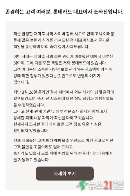 롯데카드 홈페이지에 게재된 사과문 캡쳐