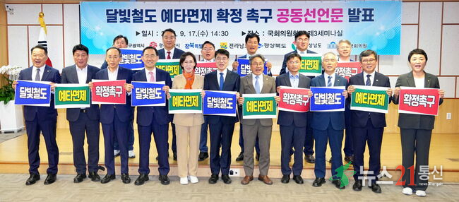 달빛철도 조속 추진 촉구 공동선언강기정 광주광역시장이 달빛철도가 경유하는 영·호남 시·도지사, 지역 국회의원들과 17일 국회에서 ‘달빛철도 예비타당성조사 면제 확정을 촉구하는 공동선언’을 발표했다.