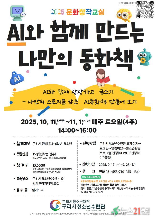 구리시청소년재단(대표이사 강종일) 청소년수련관은 ‘AI와 함께 만드는 나만의 동화책’ 프로그램 참가 신청을 9월 17일부터 29일까지 받는다고 밝혔다. 신청은 청소년수련관 홈페이지 내 ‘청소년 활동 프로그램 신청’ 메뉴에서 가능하며, 참가 회비는 15,000원이다. 모집은 선착순으로 진행된다.