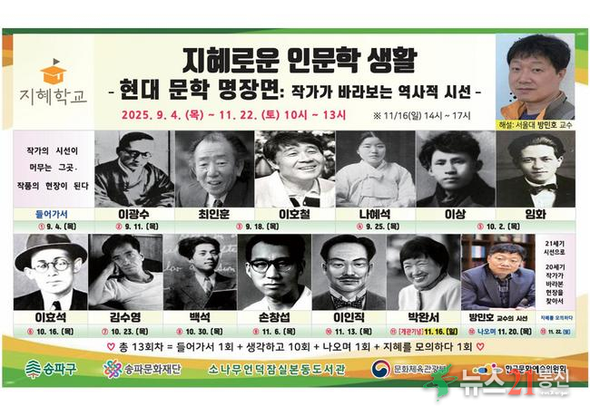 「지혜로운 인문학 생활: 현대문학 명장면 _ 작가가 바라보는 역사적 시선」은 관심 있는 작가의 회차별 신청을 인문네트워크(https://inmun360.culture.go.kr) 또는 송파구통합홈페이지(https://www.splib.or.kr)에서 할 수 있다. 더 구체적인 것은 전화(☎070-4286-1244)로 문의하면 궁금함이 해결된다. 많은 관심과 참여를 바람한다.