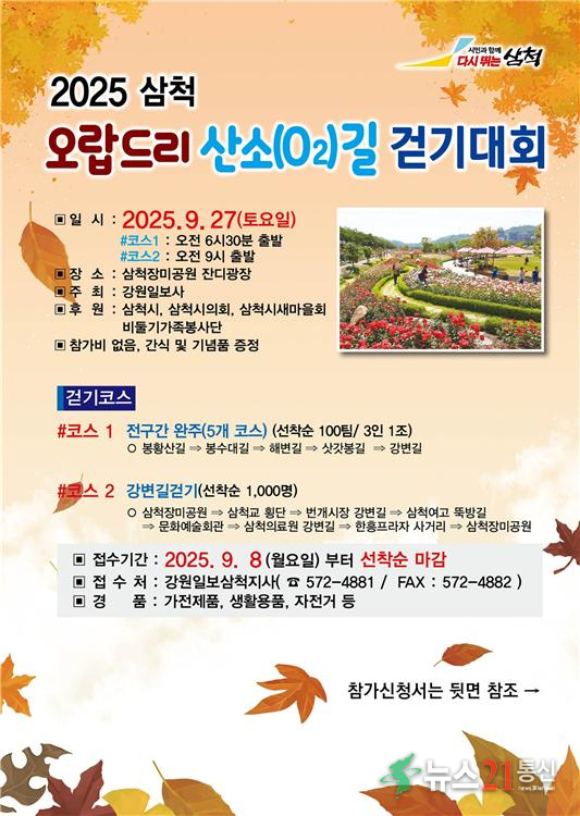 삼척시는 오는 9월 27일 삼척장미공원 잔디광장에서 「2025년 삼척 오랍드리 산소길 걷기대회」를 개최한다.
