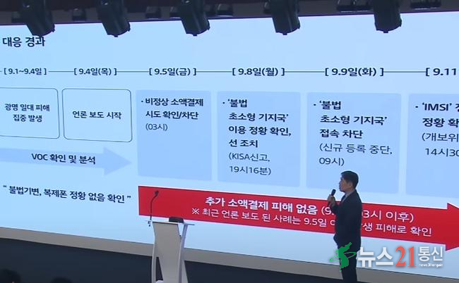회사는 지난 6월부터 ARS 인증을 거친 소액결제를 전수 조사하고, 결제·통화 패턴을 결합해 분석했다. 이후 불완전 로그 사례를 선별해 해당 고객이 접속했던 초소형 기지국 정보를 추적한 결과, 국제이동가입자식별정보(IMSI)와 국제단말기식별번호(IMEI), 휴대전화 번호 유출 정황도 확인됐다. 다만 추가 피해는 KT가 지난 5일 비정상 결제를 차단하기 전 발생한 것으로 파악됐다.