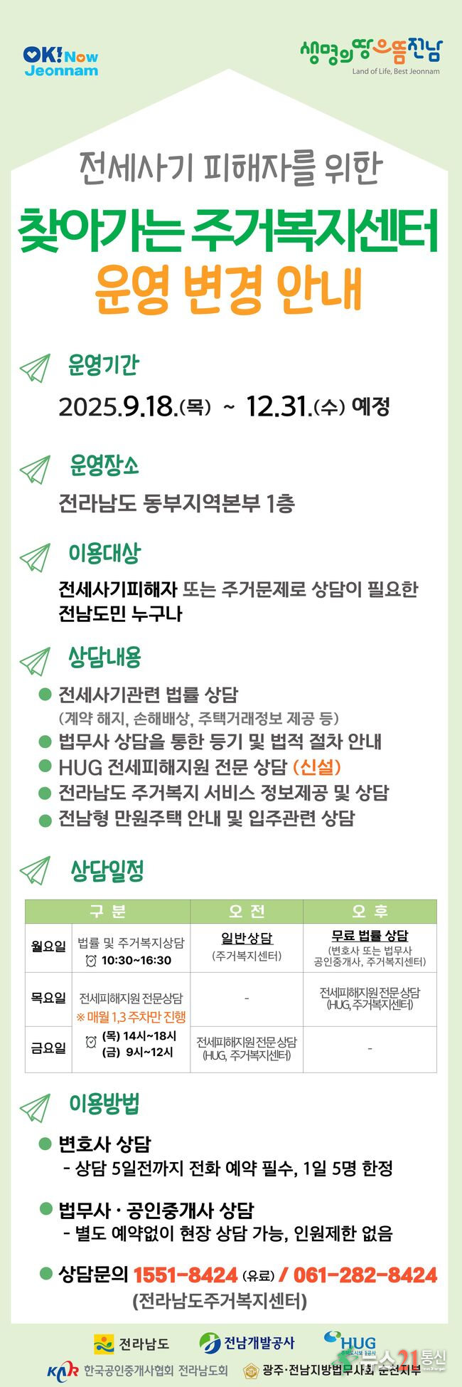 [뉴스21 통신=박찬웅 ] 전라남도가 동부지역본부에서 운영 중인 ‘전세사기 피해상담’을 확대 추진하며 도민의 주거안정과 권리보호 강화에 나섰다.