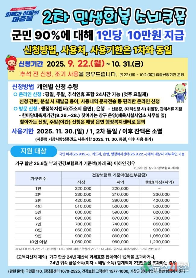 군민 90%에 대해 10만 원을 추가로 지급하며, 지급 대상은 가구별 2025년 6월 건강보험료를 기준으로 최종 90%를 선별 지급된다. 지급 대상 여부는 국민비서 ‘민생회복 소비쿠폰 안내’ 서비스를 신청하면 관련 정보를 사전 제공받을 수 있으며, 9월 22일 이후는 온라인으로 조회하거나 은행, 관할 읍면 행정복지센터 등에 직접 방문하여 조회할 수 있다.