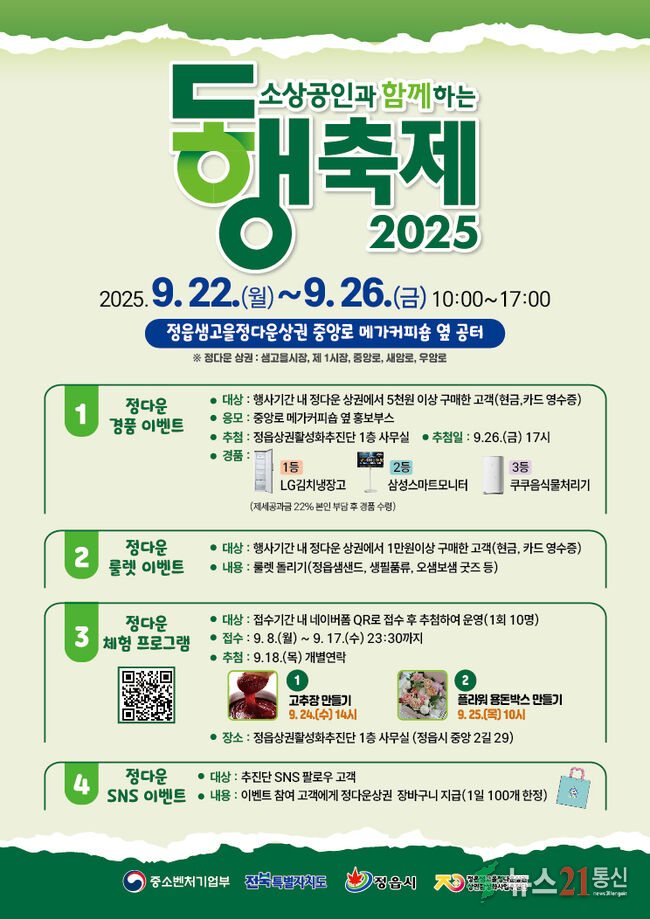 전북특별자치도 정읍시가 지역 상권 활성화를 위해 오는 22일부터 26일까지 정다운 상권 일원에서 ‘2025 정다운 할인 동행축제’를 연다.