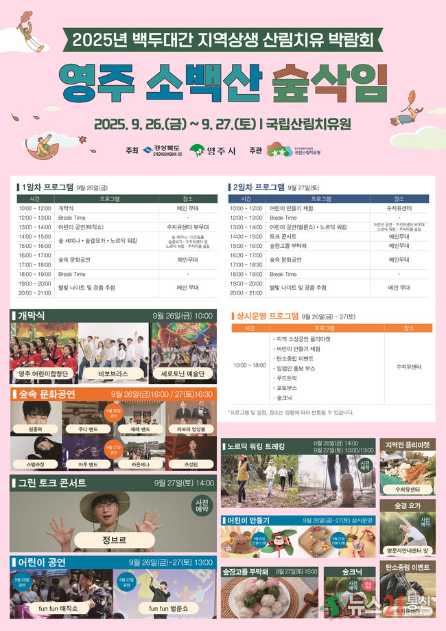 행사는 오는 26일 오전 개막식을 시작으로 ▲숲 세미나 ▲숲결요가 ▲노르딕 워킹 등 체험형 산림치유 프로그램이 마련된다. 또, 가족 단위 방문객을 위한 마술·풍선 공연이 진행되며, 숲속 무대에서는 ‘원종혁’, ‘스텔라장’ 등 인기 가수들이 참여해 공연을 선보인다. 이와 함께 생태 유튜버 ‘정브르’가 진행하는 ‘그린 토크 콘서트’도 예정돼 있어 환경과 치유의 의미를 더할 예정이다.