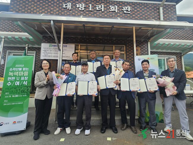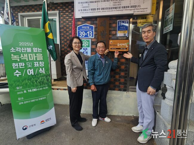 산림청(청장 김인호)은 경상북도 김천시 조마면 대방1리 마을회관에서 김천시 관계자와 마을 주민들이 참석한 가운데 ‘소각 산불 없는 우수 녹색마을 표창 및 현판 수여식’을 개최했다고 16일 밝혔다.