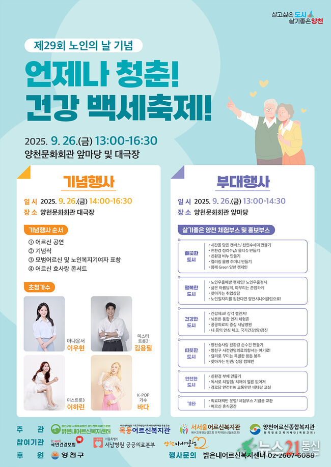 양천구(구청장 이기재)는 제29회 노인의 날(10월 2일)을 앞두고 오는 25, 26일 양일간 지역 어르신들을 위한 대규모 화합의 장 ‘언제나 청춘! 건강 백세축제’를 개최한다고 21일 밝혔다.