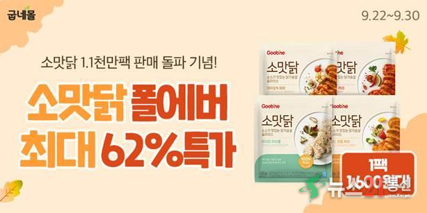 굽네몰, ‘소맛닭’ 1100만 팩 판매 돌파 기념 ‘소맛닭 폴에버’ 프로모션 진행 (사진 제공=굽네몰) 굽네가 운영하는 건강 닭가슴살 전문몰 굽네몰이 대표 제품 ‘소맛닭(소스가 맛있는 닭가슴살)’의 누적 판매 1100만 팩 돌파를 기념해 자사몰 단독 특별 프로모션을 진행한다. 이번 이벤트는 22일부터 오는 30일까지 단 9일간 진행되며, ‘소맛닭’과 인기 소스 닭가슴살 제품을 최대 62% 할인된 가격으로 선보인다.