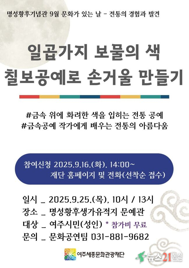 여주세종문화관광재단은 오는 9월 25일(목), 명성황후기념관 9월 문화가 있는 날 프로그램으로‘일곱가지 보물의 색, 칠보공예로 손거울 만들기’를 진행한다.