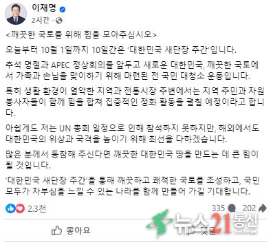 이 대통령은 22일 페이스북을 통해 “오늘부터 10월 1일까지 10일간은 ‘대한민국 새단장 주간’”이라며 “추석 명절과 APEC 정상회의를 앞두고 새로운 대한민국, 깨끗한 국토에서 가족과 손님을 맞이하기 위한 전 국민 대청소 운동”이라고 밝혔다.