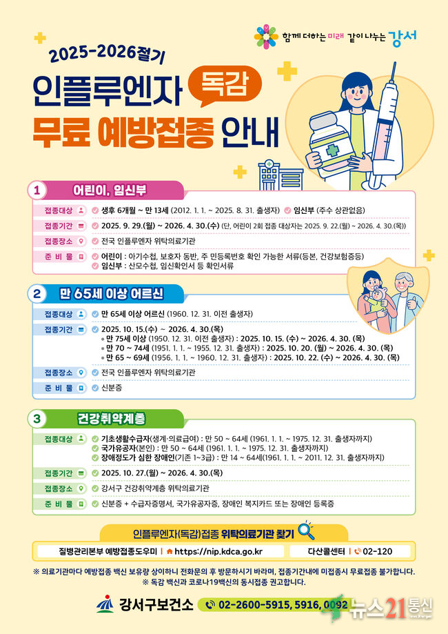 해당 접종은 강서구 건강취약계층 위탁의료기관에서 가능하며, 신분증 외에 장애복지카드, 수급자증명서, 국가유공자증 등 관련 서류를 지참해야 한다.