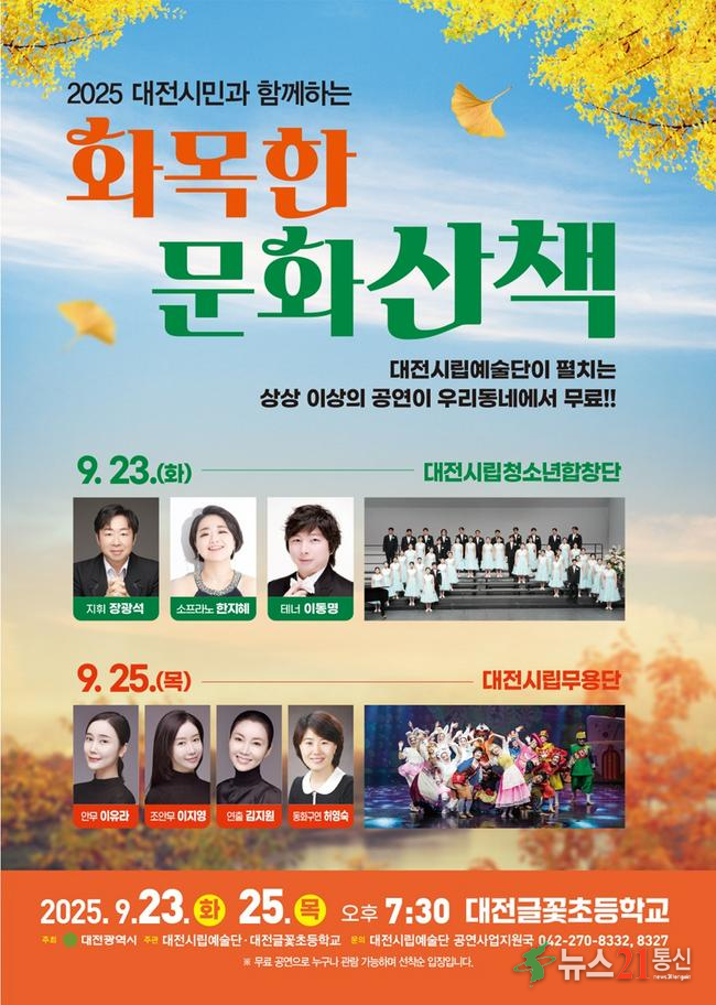 깊어가는 가을밤, 대전 중구 주민들에게 특별한 문화 선물이 찾아온다. 대전시립예술단은 오는 9월 23일(화)과 25일(목) 저녁 7시 30분, 대전글꽃초등학교 강당에서 ‘화목한 문화산책’ 공연을 연다.