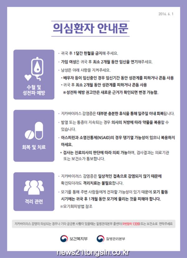 특히 임신부는 발생국가로의 여행을 연기할 것과, 일반인은 여행 중 모기물림을 주의하고, 만약 임신부가 발생국가 여행력이 있는 경우 증상과 관계없이 진단검사를 받을 수 있도록 했다.