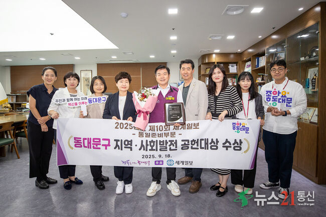 서울 동대문구(구청장 이필형)는 ‘통일준비 도시’의 모범사례로 인정받았다. 구는 지난 18일 열린「제10회 세계일보 지역·사회발전 공헌대상」시상식에서 ‘통일준비 부문’ 수상의 영예를 안았다. 이번 수상은 전국 기초자치단체 가운데 유일한 통일 분야 수상 사례다.