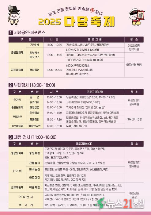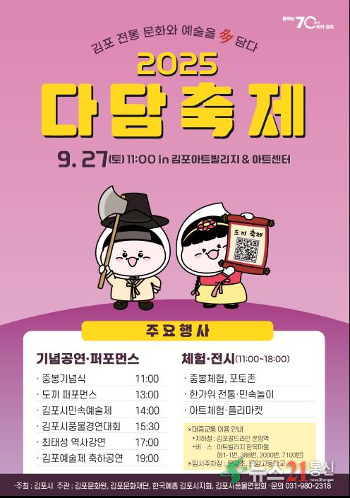 오전 11시부터 저녁까지 즐길 수 있는 이번 다담축제는 70여 개의 다양한 체험과 부대행사가 준비되어 있다. 도끼 던지기 챌린지와 도끼 공예, 페이스페인팅을 즐길 수 있고 양탕 시식과 도끼 달고나 뽑기도 참여할 수 있다. 제기와 고리던지기, 버나돌리기, 딱지 등 훈련도감 스탬프 투어와 무중력인간 퍼포먼스 공연, 사또 퀴즈대회도 진행된다. 이밖에 최태성 역사강사의 ‘중봉조헌과 김포역사’ 특강, 전통민속예술 공연이 펼쳐진다.