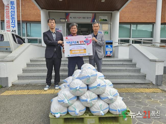 고성군 개천면의용소방대 하만희 대장은 9월 23일 지역사회 소외계층을 위한 이웃사랑 실천의 일환으로 고성군 개천면에 사랑의 쌀 300kg(10kg 30포)을 기탁했다.
